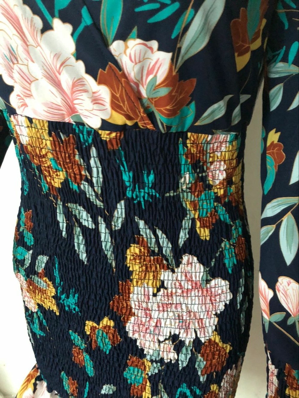 Con el Vestido estampado con escote en V y cintura elástica cruzada, te verás elegante y cómoda. El escote en V resalta tu cuello y el estampado atractivo te hará destacar. La cintura elástica cruzada mejora tu figura y te permite moverte con libertad. Perfecto para cualquier ocasión.